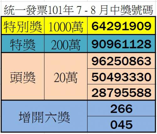 [分享] (09-25) 統一發票101年7-8月中獎號碼