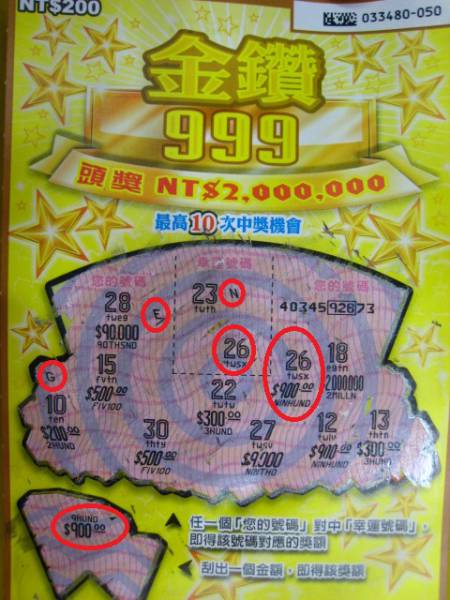 今天9/9中二張EGT 1800及NIN, 二張金鑽999是去不同家選序號尾數較容易出EGT的號碼 ,第一張中EGT 1800 ,因刮左下角中900,先刮26 又中900, 害我很HI, 以為是NIT 9000