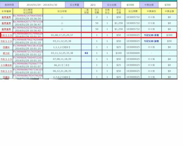 正常來說 我的澳索幣下注金額應該是300 可是自動投注清單卻只有50 (我是選6個號碼用連碰) 539六星連碰 中三隻 應該是發澳索幣獎金1050 是嗎? 所以...向板主求助...
