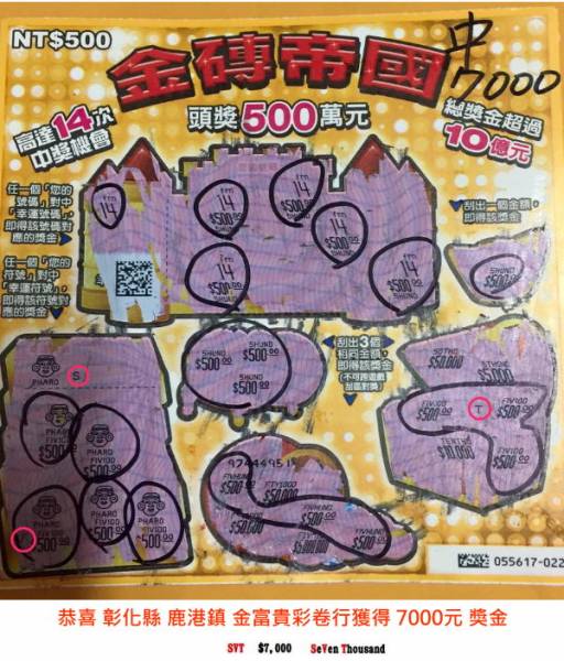 055617-022 金磚帝國(5567重疊號)每十張連號有兩張中獎機率 (彰化縣鹿港鎮金富貴彩卷行獲得7000元獎金)