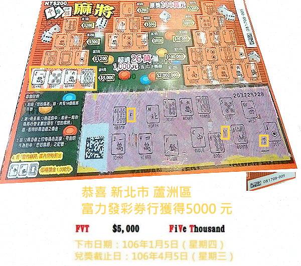 麻將2016年中5000元FVT(恭喜新北市 蘆洲區富力發彩券行獲得)