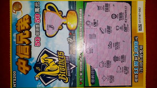 試過了好幾張,終於刮中了中信兄弟的兩千塊!!