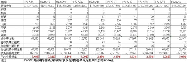 6/16端午加碼結束,統計分析加碼前後中獎狀況,很明顯的,加碼真的只是噱頭,大家的平均中獎率並沒有太大提升,而沒有高額頭獎加持後的買氣,也反映在銷售金額上,希望台彩高層以後加碼能更有誠意點...