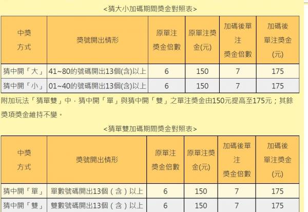 2. 附加玩法「猜大小」單注獎金由150元提高至175元。調整後「猜大小」獎項之獎金倍數與金額對照表如下: