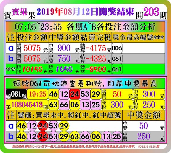 測試號碼為:2019年8月12日07:05~23:55 108045270期~108045472期