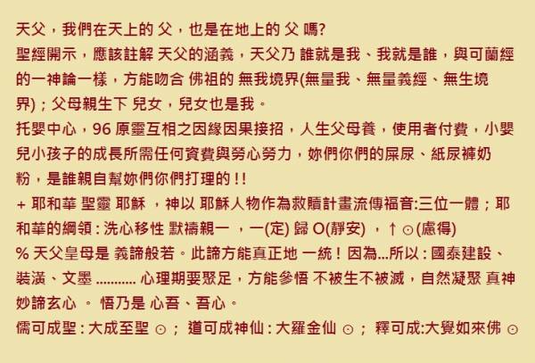 儒可成聖:大成至聖 ⊙; 道可成仙:大羅金仙 ⊙; 釋可成:大覺如來佛 ⊙ 。虛空隱我不知名(自然凝聚)。天父皇母是義諦般若。終有一天相認歡。
