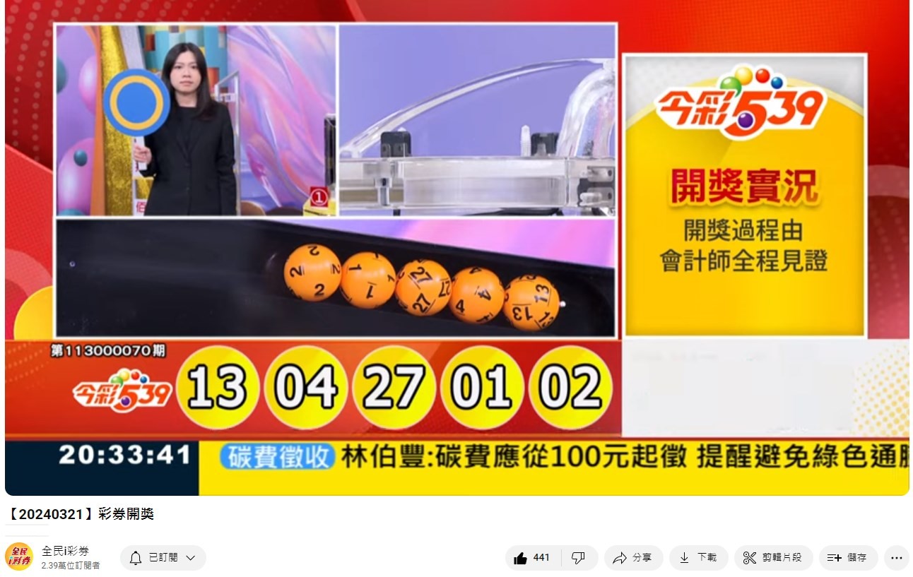 備註: 台彩因給全民兌獎方便,會在電視節目播完後,於全民i彩券YT官方頻道