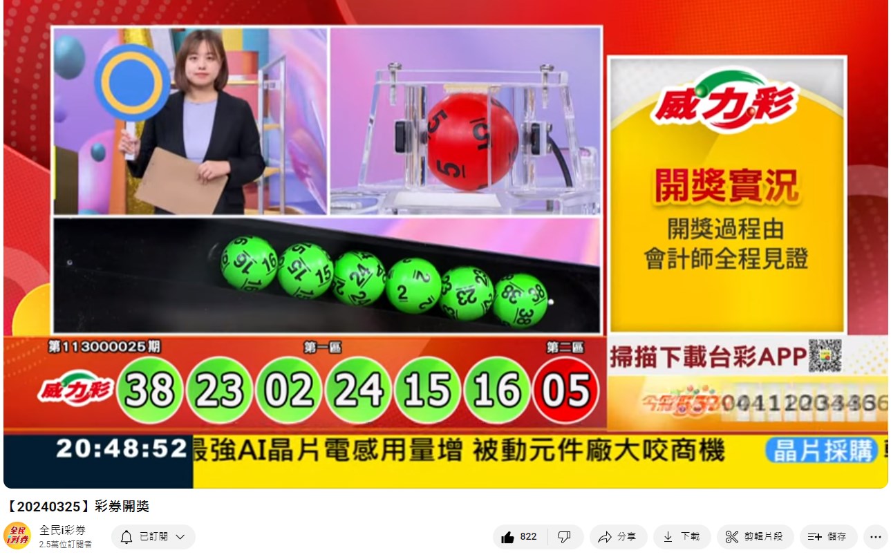 備註: 台彩因給全民兌獎方便,會在電視節目播完後,於全民i彩券YT官方頻道