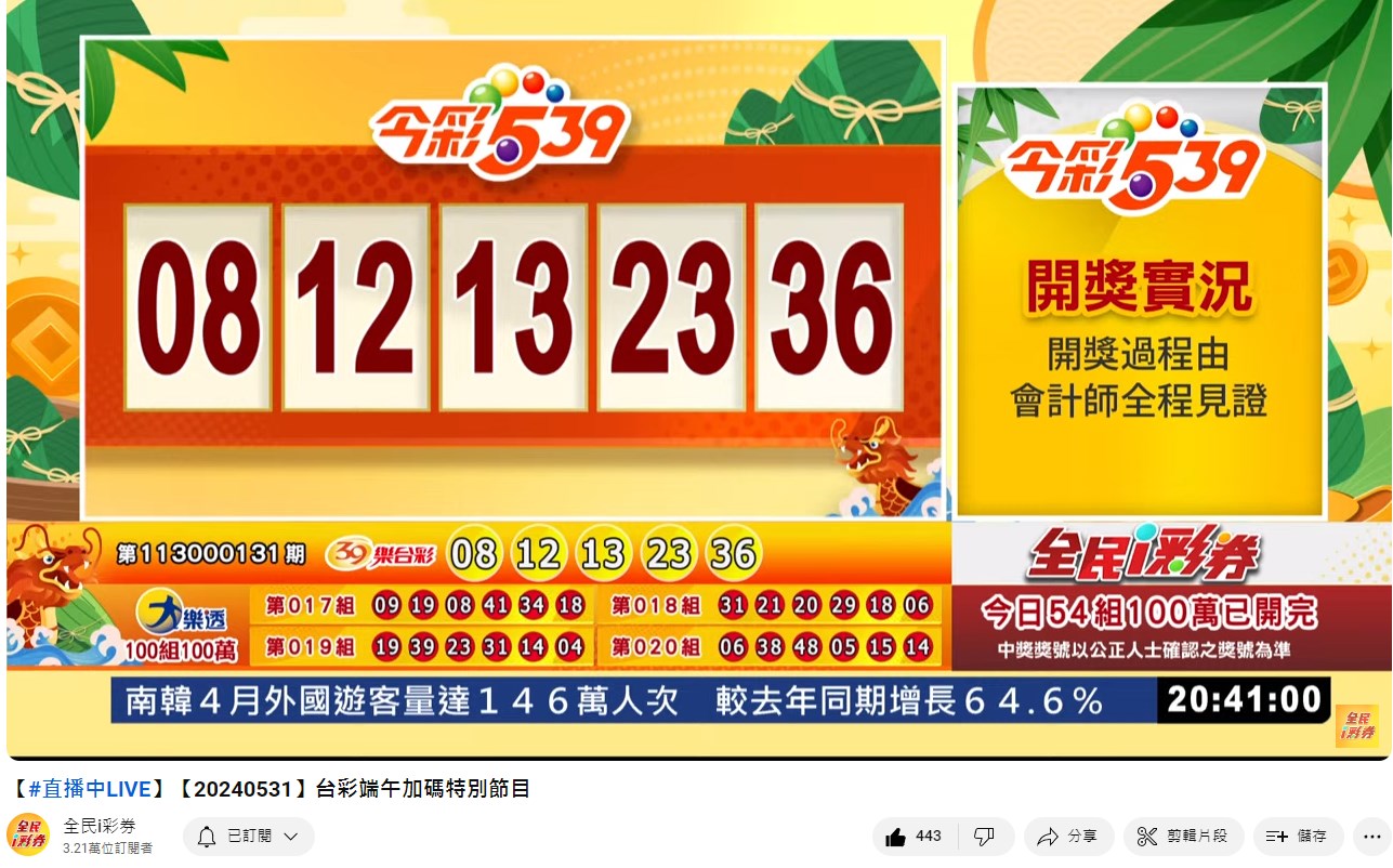 備註: 台彩因給全民兌獎方便,會在電視節目播完後,於全民i彩券YT官方頻道