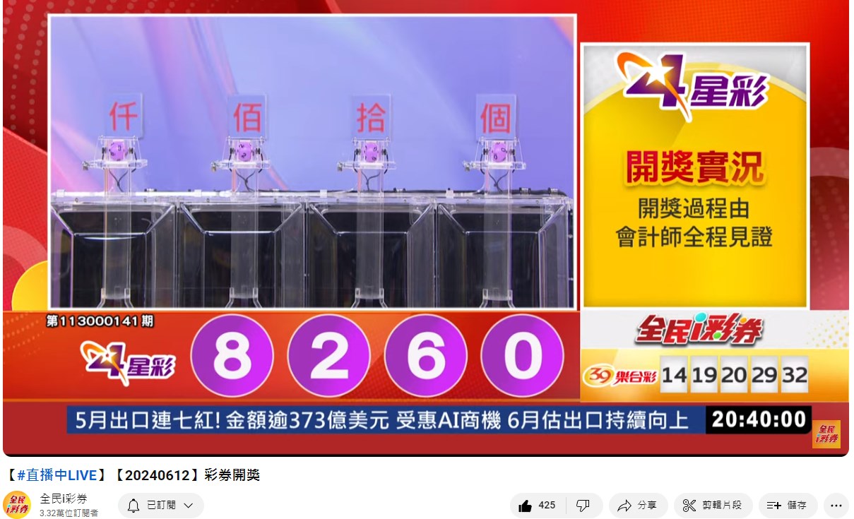 備註: 台彩因給全民兌獎方便,會在電視節目播完後,於全民i彩券YT官方頻道