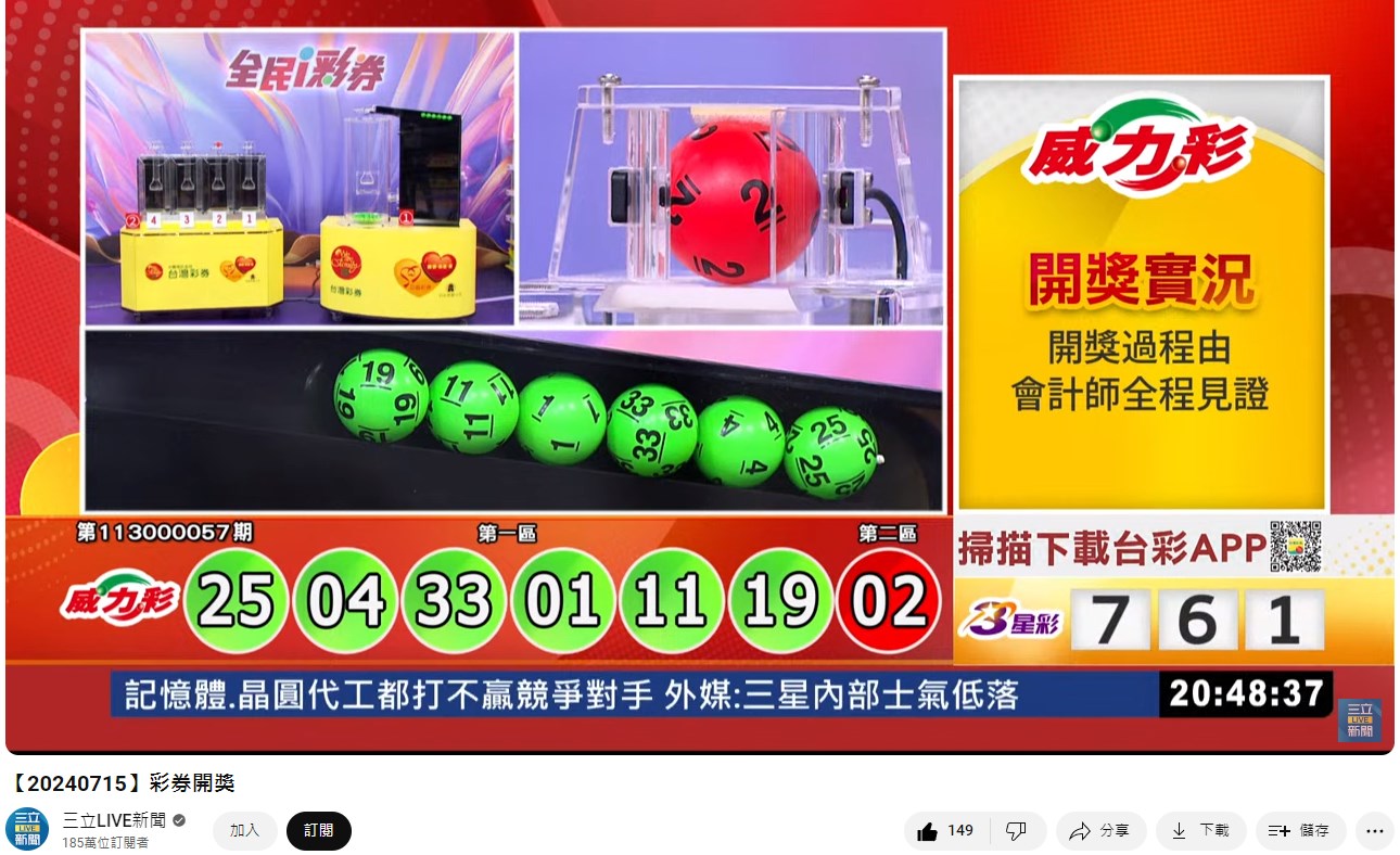 專區【全民i彩券】台灣彩券開獎實況轉播 威力彩、今彩539、三星彩、四星彩 |三立新聞網 SETN.com - YouTube