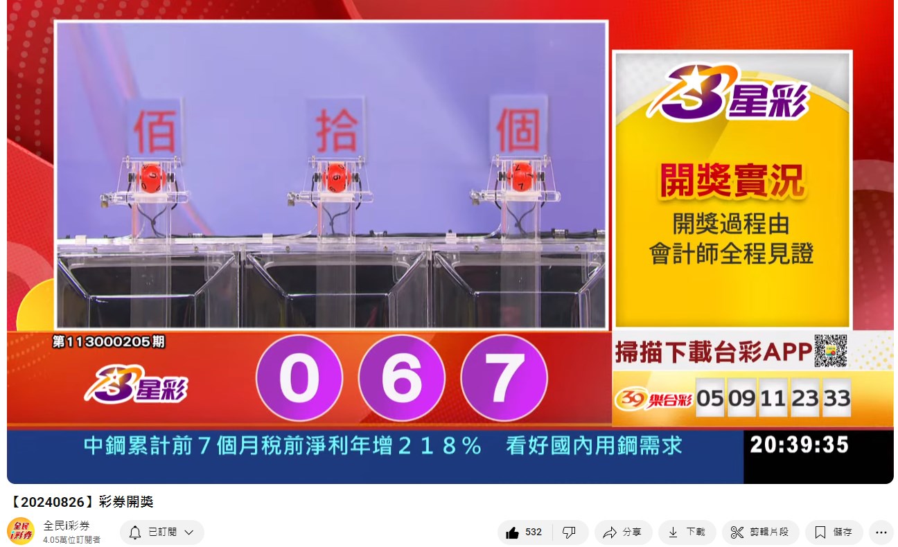 備註: 台彩因給全民兌獎方便,會在電視節目播完後,於全民i彩券YT官方頻道