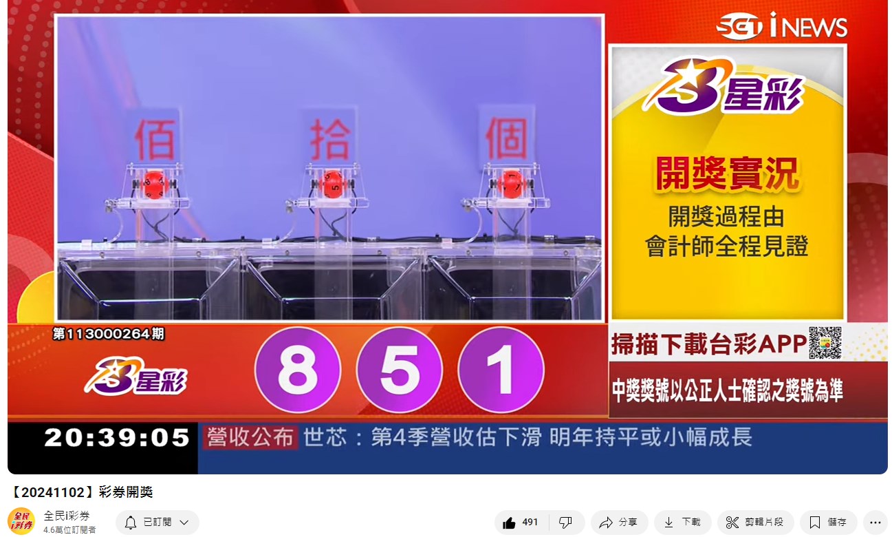 備註: 台彩因給全民兌獎方便,會在電視節目播完後,於全民i彩券YT官方頻道