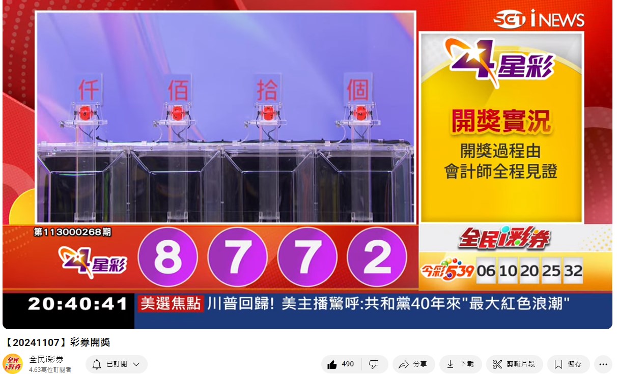備註: 台彩因給全民兌獎方便,會在電視節目播完後,於全民i彩券YT官方頻道