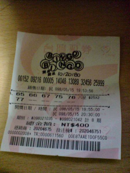 心情不好 就完沒完過的賓果 自己選了65.66.67.75.76.77共8期*2=400員