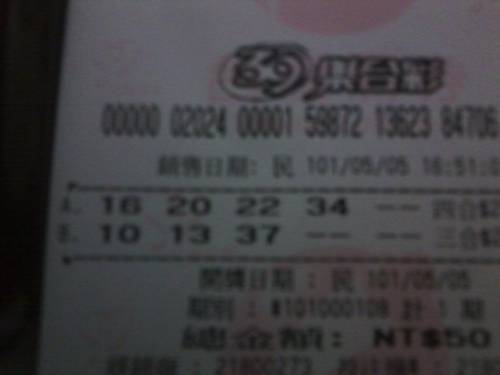 我自已簽的都沒中只有中1之20 10 13 37是我要出門前叫我媽劃的....